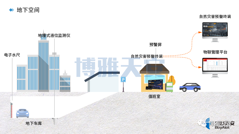 Boya Tian‘an provides comprehensive solutions for monitoring water in underground Spaces. The natural disaster early warning terminal can issue early warnings to underground space managers and on-duty personnel in time, reminding them to take disaster avoidance measures in advance to cope with extreme weather such as heavy rain, typhoons and lightning. At the same time, Internet of Things sensing devices such as buried water monitors or electronic water gauges can monitor the water situation in the underground space in real time, ensuring that the water problem can be timely response and treatment.