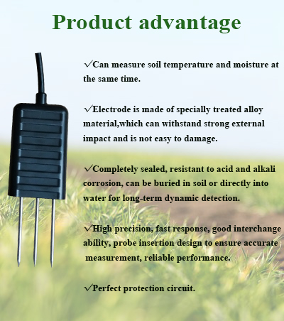 BOY-SO06 Integrated soil temperature and humidity sensor has stable performance and high sensitivity, and can measure soil temperature and soil moisture simultaneously. By measuring the dielectric constant of soil, the true water content of various soils can be directly and stably reflected. The soil moisture sensor can measure the volume percentage of soil moisture and is a soil moisture measurement method that meets the current international standards. It is suitable for soil moisture monitoring, scientific experiment, agricultural irrigation, greenhouse, flowers and vegetables, grassland and pasture, soil rapid measurement, plant culture and other occasions.