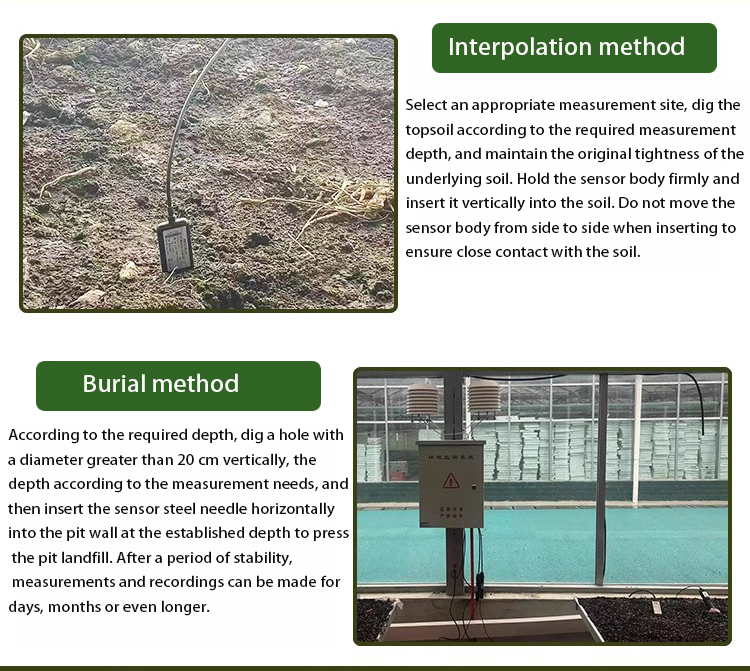 1. The steel needle of the sensor is completely inserted into the soil under test. Do not shake the sensor during insertion to avoid affecting the sensor probe;