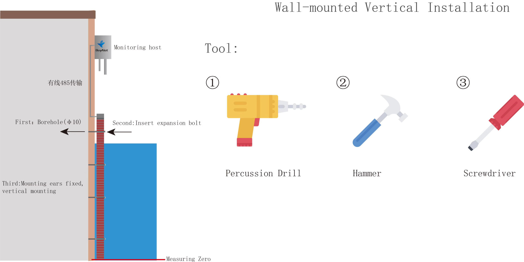 The Wall-mounted vertical installation is often used in the measurement scenarios of road water, culvert water, reservoir, river and lake.